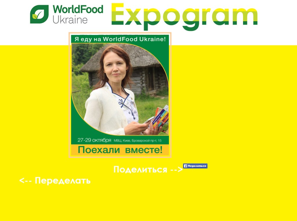 Завдання: створити додаток Експограм, який дозволяє користувачам завантажувати фотографії, додавати значок «Я їду на виставку» і ділиться фотографією у фейсбуці. Вигляд робіт: розробка модуля на php5. 1 крок -завантаження фотографії до редактора 2 крок — вибір рамочки 3 крок – віконце з готовою фотографією і кнопкою «Поділитися»