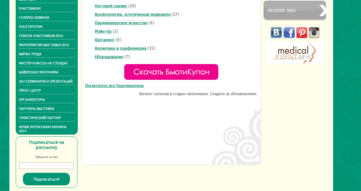 Завдання: розробити модуль сервісу Бьютікупон для виставки Інтершарм Використанні технології: php, mysql Опис: Експоненти надають інформацію про акції, що проводяться на стендах під час виставки, а відвідувачі за допомогою купонів можуть купувати товари та послуги експонентів при відвідуванні виставки зі знижкою. В адміністративній панелі сайту можна додавати акції та переглядати […]
