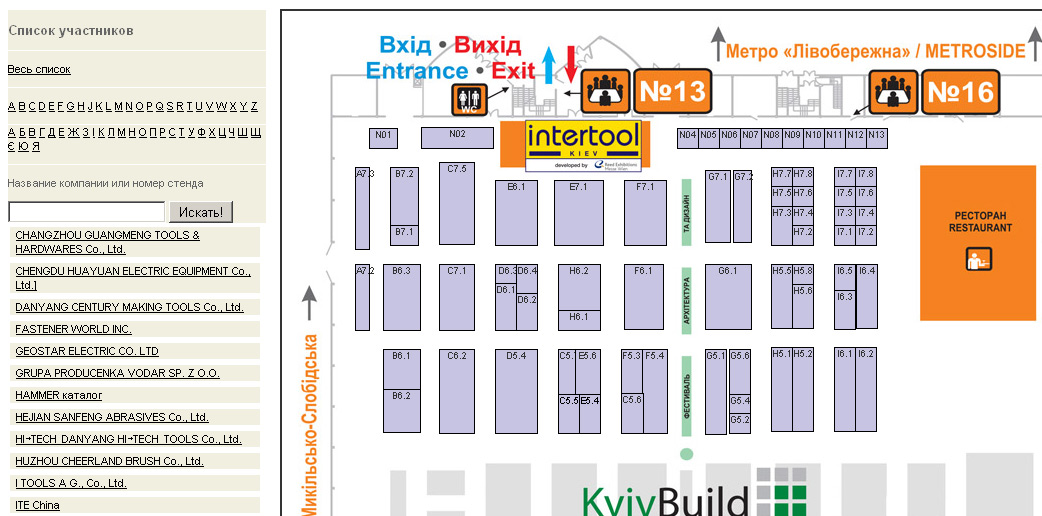 Завдання: розробити інтерактивний план виставки з зручним пошуком стендів Відвідувачі виставки можуть шукати необхідну компанію у списку компаній за назвою або тематикою, на плані автоматично підсвічується стенд компанії. При наведенні на стенд на плані відвідувач бачить назву компанії та основну інформацію.